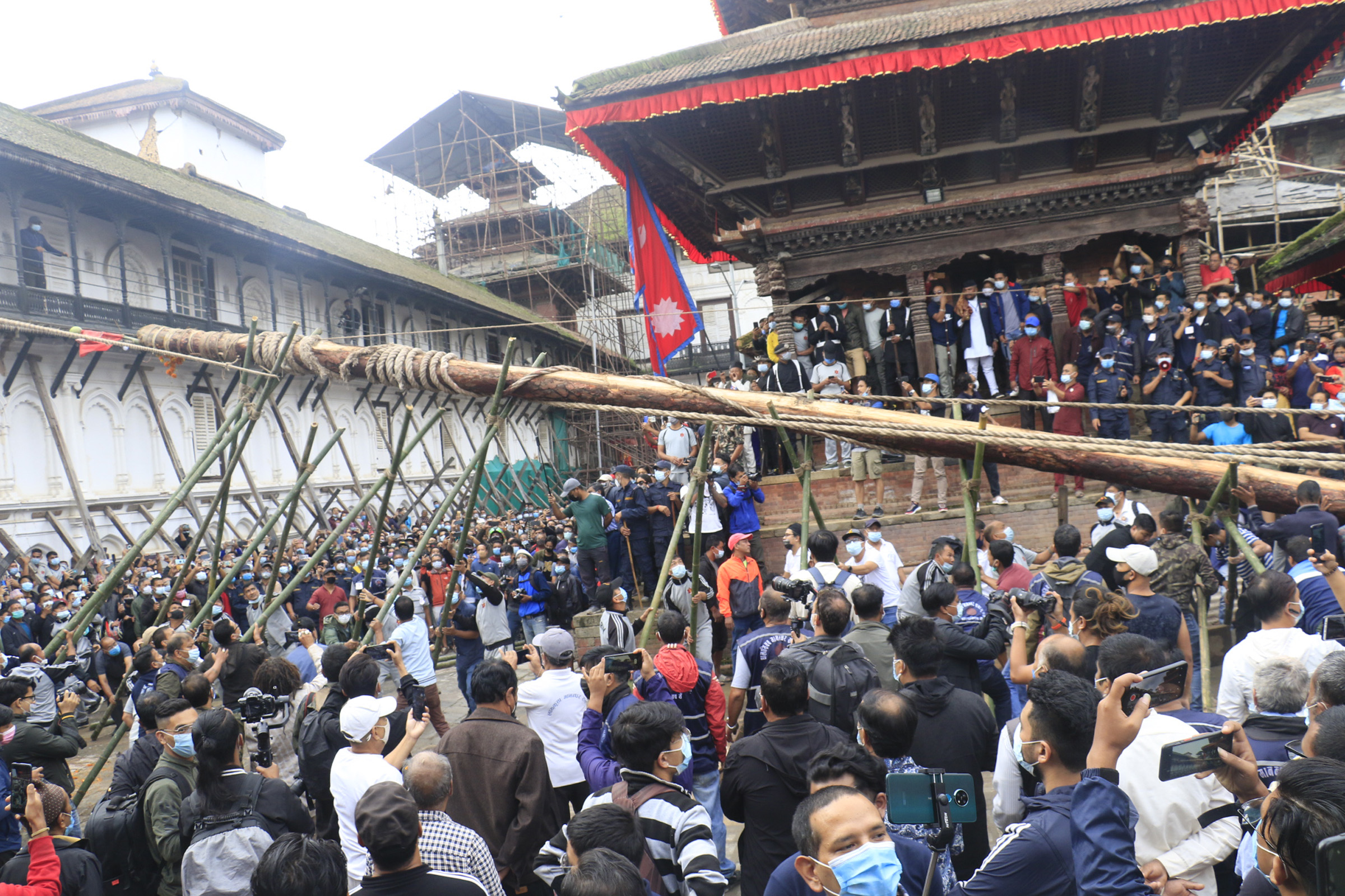 The erection of lingo took place at auspicious time (6:51 am) as determined by Nepal Panchanga Nirnayak Samiti (Calendar Determination Committee), said Sandip Khanal, chief of the office to look after the durbar square.