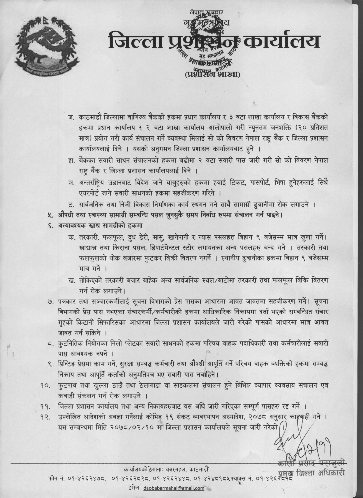 काठमाडौं उपत्यकामा एक सात लम्बियो कडा प्रावधानसहित निषेधाज्ञा, एक हप्तालाई पुग्ने खाद्यान्न किनेर राख्न काठमाडौं उपत्यकाका सिडिओको आग्रह