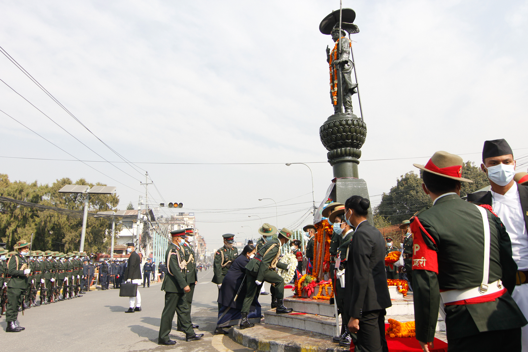 President Bhandari offered floral tributes to the statue of Shah, visiting the Main Gate of Singhadurbar today.