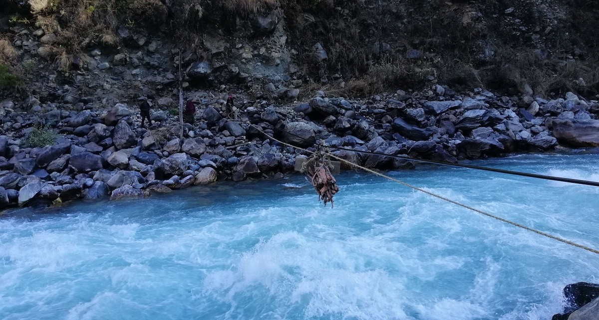 Locals of Sarkegad Gaonpalika-2 of Humla using Tuin to cross the Karnali River. When there is no bridge here, people use barges, hay, firewood and tuin.
